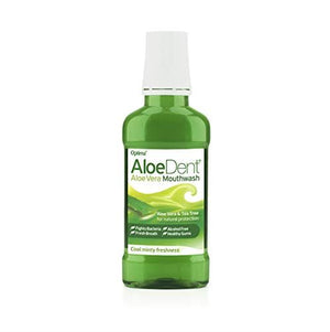 Aloe Dent Mouthwash is a minty fresh, alcohol free, saccharin free mouthwash alternative. It provides total protection, fights plaque and bacteria to help maintain strong teeth and healthy gums. Aloe Dent Mouthwash is made using natural ingredients tea tree and grapefruit seed extract which act as natural antiseptic and antibacterial. Aloe Dent mouthwash is free from alcohol and saccharin. Using 100% Aloe Vera and these pure essential oils, Aloe Dent provides a natural and soothing antibacterial action plus minty fresh breath. The herbs and vitamins combine to promote healthy gums and strong teeth. UsageFill cap, rinse around mouth thoroughly for a minute and spit out. Ingredients: Aqua, Aloe Barbadensis, Sorbitol, Polysorbate 20, Citrus Paradisi (Grapefruit Seed Extract), Mentha Piperita, Sodium Lauroyl Sarcosinate, Aroma Menthol, Melaleuca Alternifolia (Tea Tree Oil), Phytonadione (Vitamin K), Escin (Horse Chestnut), Centella Asiatica (Indian Pennywort), Xylitol Sodium Hydroxymethylglycinate, Citric Acid, CI 75810