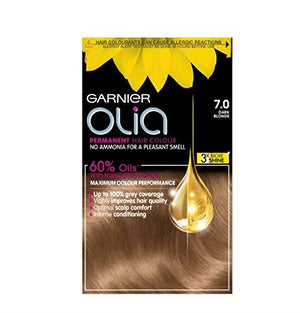 Product DescriptionDiscover Garnier Olia Permanent No Ammonia Hair Dye. 60 Percent oil powered hair dye with up to 100 Percent grey coverage. Maximum colour performance, for long-lasting at home hair colour results. On grey hair, colour will appear lighter than on non-grey hair. Choosing ideal shade: hair dye colour result will vary depending on natural hair colour - check the back of pack. If are deciding between two shades, always choose the lighter. Remember to always do patch test 48 hours before colouring hair at home. Top tips: Use an old towel as hair colour may stain it. Apply moisturising cream to hairline to avoid staining. Garnier know that oil can do much more than just condition hair. When concentrated at the heart of the Olia permanent blonde hair dye formula, oil maximises the blonde hair colour result. Garnier Olia permanent hair dye is a 60 Percent oil-powered formula, with natural flower oils and ammonia free for a pleasant scent. Garnier at home hair dye visibly improves the quality of hair, for 3 x shiner** and 35 Percent smoother hair**. Olia home hair colour will also provide maximum colour performance for lavish, vivid and long-lasting blonde hair. Plus, Olia permanent hair colour has a distinct sensorial application and optimal scalp comfort with Garnier non-drip smooth velvety texture of the colourant cream. ** Instrumental test vs before and after colouration.How to find the ideal blonde shade for:Have ever wondered what the hair colour numbers mean? The first number of a Hair Colour is how Light or Dark the blonde hair dye will be, for example blonde shades range from 7, Dark Blonde to 10, Very Light Blonde. The second number is the reflect which can be Natural (.0), Warm (.3, .4, .5, .6) or Cool (.1, .2). For example, 7.0 is a Natural Dark Blonde, 7.3 is a Golden Dark Blonde and 10.1 is a Very Light Ash Blonde. Always check the back of pack to see if it is the right shade for. If have dark hair and want to dye hair blonde, will need to bleach first.Ingredients1114814 Colourant Cream: Paraffinum Liquidum / Mineral Oil, Aqua / Water, Ethanolamine, Steareth-20, Caprylyl/Capryl Glucoside, Polysorbate 21, Steareth-2, m-Aminophenol, p-Aminophenol, Ascorbic Acid, Sodium Metabisulfite, Thioglycerin, Toluene-2, 5-Diamine, Polyquaternium-67, Helianthus Annuus Seed Oil / Sunflower Seed Oil, Limnanthes Alba Seed Oil / Meadowfoam Seed Oil, Camellia Oleifera Seed Oil, Resorcinol, Passiflora Incarnata / Passiflora Incarnata Seed Oil, EDTA, Parfum / Fragrance,1190276 - Developer Cream: Aqua / Water, Paraffinum Liquidum / Mineral Oil, Cetearyl Alcohol, Hydrogen Peroxide, Steareth-20, PEG-4 Rapeseedamide, Tocopherol, Sodium Salicylate, Polyquaternium-6, Phosphoric Acid, Tetrasodium Etidronate, Tetrasodium Pyrophosphate, Hexadimethrine Chloride, Glycerin,1119728 A - Conditioner: Aqua / Water, Cetearyl Alcohol, Behentrimonium Chloride, Cetyl Esters, Tocopherol, Trideceth-6, Chlorhexidine Digluconate, Helianthus Annuus Seed Oil / Sunflower Seed Oil, Camellia Oleifera Seed Oil, Amodimethicone, Isopropyl Alcohol, Citric Acid, Cetrimonium Chloride, Parfum / Fragrance,Please Check Back of Pack for Latest Ingredients ListDirectionsHow to dye your hair at home with Garnier Olia No Ammonia Permanent Hair Dye: Always do a patch test 48 hours in advance of using any home hair dye products. Please always refer to the product for full safety instructions. Top tips for home hair dye: Use an old towel as permanent hair dye may stain it. Apply moisturising cream to your hairline to avoid staining from the permanent hair dye. Hair Dye can only lighten your natural hair colour 1 to 2 levels - check the back of pack to see if it is the right hair colour shade for you. If you have long or thick hair, use two hair dye boxes. 1. Start by putting on gloves and instantly mix the colour cream and the developer cream in the applicator bottle. Shake well to mix. 2. Apply the mix in sections, starting with your roots and working t