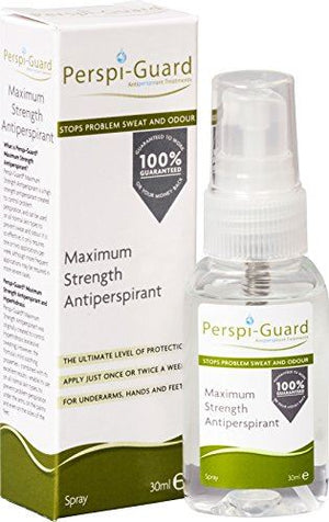 Dual Active FormulationPerspi-Guard Maximum Strength Antiperspirant Spray is an exceptionally effective solution to excessive sweating. It ensures complete protection from both sweat and odour, whilst remaining remarkably gentle on the skin. The product's concentrated formulation is so effective that it only requires application once or twice per week.Clinically Proven To Reduce Problem Sweat and OdourPerspi-Guard Maximum Strength Antiperspirant Spray has been clinically proven to dramatically reduce excessive sweating under the arms. It provides an incredible five days protection from sweat and odour from just one application (although more frequent application may be required in some cases).Specialist Formula for HyperhidrosisThe specialist formula in Perspi-Guard Maximum Strength Antiperspirant Spray was originally created for sufferers of excessive sweating, also known medically as hyperhidrosis. However, as it is so gentle on the skin, it is perfectly suited for non-sufferers too. Perspi-Guard Maximum Strength Antiperspirant Spray is unscented, and designed for use by both male and female users of all normal skin types.100% Guaranteed To Work Or Your Money BackFor your total peace of mind, Perspi-Guard Maximum Strength Antiperspirant Spray comes with a manufacturer's Money Back Guarantee. In the unlikely event that you find it unsuccessful, simply contact the manufacturer to arrange a full refund of the purchase price.IngredientsEthyl Alcohol, Aqua, Aluminium Chloride, Aluminium Chlorohydrate, Glycerin, Alcloxa, Dimethicone Copolyol, Propylene Glycol, Triethyl Citrate.DirectionsApply only once or twice a week to remain sweat and odour free. In extreme cases, more frequent application may be required. Must be applied at night before bed to clean, dry skin. Spray 2-3 times onto treatment areas and allow to dry. In the morning, shower or wash as normal. Do not use with any other antiperspirant as this may reduce effectiveness. Scented body spray can be used to provide fragrance.Safety WarningIf irritation occurs discontinue use. Do not use on broken or damaged skin, or immediately after shaving underarms. For external use only. Keep away from eyes. Keep out of reach of children. Store at room temperature, away from direct sunlight. If swallowed, seek immediate medical advice and show box. Flammable.Box Contains1 x Maximum Strength Antiperspirant Spray 30ml The ultimate level of protection from sweat and odour | Concentrated formula= 30ml lasts the average user 2-3 months! | Apply at night before bed just once or twice per week | For underarms, hands and feet | Originally designed for Hyperhidrosis (excessive sweating)