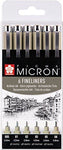 Pack of 6 black pens - 005, 01, 02, 03, 05, 08 nib sizes.Pigma Micron is a permanent, fade resistant, chemically stable, pigment-based ink will not bleed or run if liquids are spilled on or applied to the document after the ink has dried. Perfect for legal situations, Pigma ink is nearly impossible to alter on documents, in log-books. It?s no wonder architects, archivists, anthropologists, entomologists and laboratories depend on Pigma Micron for record keeping. Manga artists, professional illustrators and watercolourists use the seven-point sizes to create precision lines. Scrapbook enthusiasts and crafters require its archival quality for preserving memories in journals, and for making cards, quilts and dolls. Use Pigma Micron to leave a mark that will last a lifetime. Pigma ink, invented by Sakura over 25 years ago, continues to be the most reliable permanent ink on the market today. Artists, consumers, the government, and scientists consider Pigma Micron a necessary basic tool for any archival-quality, handwritten project. Box Contains 6 x black fineliners (1x 0.20mm 1x 0.25mm 1x 0.30mm 1x 0.35mm 1x 0.45mm 1x 0.50mm) Sizes 005, 01, 02, 03, 04, 05 = 0.20, 0.25, 0.30, 0.35, 0.40, 0.50mm line widths | Archival Ink Pens (Black) - PO(XSDK-6)