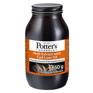 Potter?s Herbals Malt Extract (Butterscotch Flavoured) is of the finest nutritious quality which is easily digested and palatable with the added natural goodness of cod liver oil providing vital Vitamins A & D. Many people dislike Cod Liver Oils distinctive flavour and find it hard to digest. A special process is used to combine Cod Liver Oil with Malt, making a pleasantly flavoured product which is efficiently digested. Cod Liver Oil has been valued by generations as a natural source of vitamin A and D. Vitamin A contributes to the maintenance of normal skin and vision and Vitamin D contributes to the maintenance of normal bones and muscle function and the normal function of the immune system. to the normal function of the immune system and maintenance of normal bones.Potter s Herbals Malt Extract with Cod Liver Oil is also available unflavoured. Each ingredient in a Potter?s remedy works in harmony with the others.IndicationsA traditional and nutritious malt extract of the finest quality. It is one of nature s natural sugars with the added natural goodness of cod liver oil providing vital sources of vitamin A and D. Vitamin D contributes to the absorbtion of calcium and maintenance of normal bones and muscle function. Easily digested and palatable. Provides Vitamin D which contributes to the normal function of the immune system and maintenance of normal bones.IngredientsMalt Extract (from Barley), cod liver oil (Fish), butterscotch flavouring. Free from artificial colours, flavours & preservativesDirectionsAdults and adolescents over 12 years: 1/2 tablespoonful daily (15-30g), 5-12 years: 1-2 teaspoonfuls daily (10-20g), 1-5 years: 1/2-1 teaspoonful daily (5-10g). Adults and adolescents over 12 years: ¬Ω-1 tablespoon daily (15-30g), for 5-12 years: 1-2 teaspoons daily (10-20g) and for 1-5 years: ¬Ω -1 teaspoon daily (5-10g).Safety WarningFor all allergens including cereals containing gluten, see ingredients on lable label in boldBox Contains1 jar of Potter s Herbals Malt Extract & CLO with ButterscotchManufacturer Contact Information+44 1202 449 752