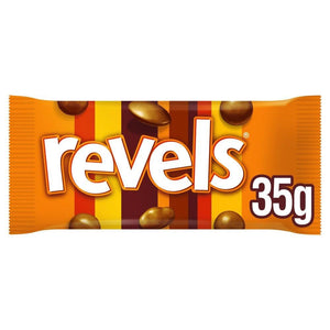 Mars Revels Chocolate Standard Bag 35 g Ingredients Sugar, Skimmed Milk Powder, Cocoa Butter, Palm Fat, Cocoa Mass, Glucose Syrup, Raisins, Sweetened Condensed Skimmed Milk, Lactose, Whey Powder (from Milk), Milk Fat, Glucose-Fructose Syrup, Barley Malt Extract, Emulsifiers (Soya Lecithin, E492, E306), Wheat Flour, Palm Oil, Salt, Modified Starch, Raising Agents (E341, E500, E501), Dextrin, Acidity Regulators (E330, E331), Flavourings (contains Celery), Glazing Agent (Pectin), Colours (E160a, E163), Natural Vanilla Extract, Coconut Oil, Milk Choc Milk chocolates with assorted centres | Suitable for vegetarians | Milk chocolate contains vegetable fats in addition to cocoa butter | Milk chocolates with assorted centres | Suitable for vegetarians | Milk chocolate contains vegetable fats in addition to cocoa butter