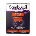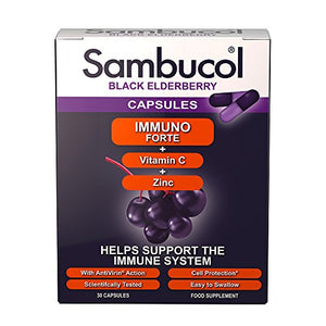 Sambucol Immuno Forte Capsules 30sSambucol is a range of great tasting food supplements founded on the unique qualities of Black Elderberries. Sambucol?s Black Elderberries contain a mode of action called AntiVirin and is high in antioxidants. Sambucol Immuno Forte range also contains Vitamin C and Zinc to help support the immune system. Sambucol Immuno Forte Capsules are ideal for those who don?t like liquids or want a high strength immune support format that?s easy to carry around. Each capsule contains Sambucol Black Elderberry, Vitamin C and Zinc. Key facts: Suitable from 12 years+ AntiVirin action High antioxidant levels Easy to swallow, one-a-day capsules, ideal when you are on the go Contains no artificial colours or flavours Contains no added sugar, yeast or milk derivatives Non-drowsy Gluten free Nutritional Information: Ingredient: Per capsule %NRV Black Elderberry 3.8g - Vitamin C 200mg 250% Zinc 6mg 60% To use: Recommended daily dose: 1 capsule daily to be taken after food with a cold drink. Not to be chewed. Winter dose: 2 capsules per day. Caution: To be swallowed whole. Not suitable for children aged below 12. Store below 25°C in a dry place out of direct sunlight and out of sight and reach of children. Do not exceed the recommended dosage. Do not take on an empty stomach. If pregnant, breast feeding or under medical supervision, please seek medical advice before taking. Not suitable for vegetarians. Ingredients: Vitamin C (Ascorbic Acid), Freeze-Dried Black Elderberry Juice Extract (Sambucus nigra) (AntiVirin), Capsule Shell [Gelatine, Colours (Carmoisine, Indigotine, Patent Blue V)], Bulking Agent (Maltodextrin), Zinc Sulphate, Anti-Caking Agents (Magnesium Stearate, Silicon Dioxide). Food supplements should not replace a balanced and varied diet and a healthy lifestyle.IndicationsFood supplements should not be used as a substitute for a varied and balanced diet and a healthy lifestyle. Store below 30°C, away from direct sunlight and out of sight and reach of children. Protect from moisture.IngredientsVitamin C (Ascorbic Acid), Spray Dried Black Elderberry Juice Extract (Sambucus Nigra L.), Bulking Agent (Maltodextrin), Capsule Shell (Hydroxypropylmethyl Cellulose), Zinc Sulphate, Anti-Caking Agents (Magnesium Stearate, Silicon Dioxide).Directions1 capsule daily. In Winter: 2 capsules daily.Safety WarningDo not exceed the recommended daily dose unless advised by your healthcare professional. Consult your healthcare professional before taking if your are under medical supervision, on medication, pregnant or are breastfeeding.Box Contains30 capsules B008DRYQ3O