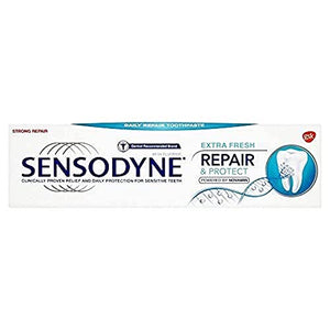 Sensitivity occurs when the dentine underneath the tooth enamel and gums becomes exposed. When exposed dentine comes into contact with hot or cold, sweet, sour or even your toothbrush it can trigger the nerve, causing a short sharp pain. It?s possible to treat the pain of sensitive teeth and to repair(1) these vulnerable areas. Sensodyne Repair & Protect Extra Fresh helps to repair and protect the sensitive areas of your teeth. Brush twice a day for lasting sensitivity protection. It also contains fluoride to help strengthen teeth and has a fresh minty taste to leave your mouth feeling clean and fresh. Sensodyne Repair & Protect, powered by NovaMin, is a distinct, clinically proven calcium formulation. It helps to repair* vulnerable areas with the natural building blocks of teeth. It relieves painful sensitivity to help you enjoy life without worrying about the pain of sensitive teeth. (1) Forms a protective layer over the sensitive areas of the teeth. Ingredients Glycerin, PEG-8, Silica, Calcium Sodium Phosphosilicate (NovaMin), Sodium Lauryl Sulfate, Sodium Monofluorophosphate, Aroma, Titanium Dioxide, Carbomer, Sodium Saccharin, Limonene, Linalool. Contains: Sodium Monofluorophosphate 1.08% w/w (1450 ppm fluoride). Directions Brush twice a day and no more than three times, minimise swallowing and spit out. Safety Warning If irritation occurs, discontinue use. Sensitive teeth may indicate an underlying problem that needs prompt care. If symptoms persist or worsen see your dentist. Keep out of reach of children. Not for use by children under 12 years of age unless on advice of a dental professional or doctor. Box Contains 75 ml Manufacturer Contact Information Po Box 89 Brentford Middlesex Tw8 9Gs
