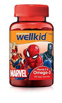 Protecting the universe. Wellkid Marvel Omega-3 and vitamin D gummies provide nutritional support for your young hero on-the-go. They are packed with highest quality DHA derived from natural vegan plant sources (algae).IngredientsGlucose Syrup, Sugar, Oil from the Microalgae Schizochytrium sp., Gelling Agent: Pectins, Acidity Regulators: Citric Acid & Potassium Citrates, Turmeric Extract, Natural orange Flavouring, Black Carrot juice Concentrate, Antioxidant: Mixed Tocopherols, Coating: Vegetable Oils (Coconut Oil, Rapeseed Oil) and Glazing Agent (Carnauba Wax), Vitamin D3 (Cholecalciferol [Vegan]).DirectionsCHILDREN (7-14 YRS): CHEW ONE OR TWO PER DAY. Do not exceed the recommended intake. Do not give to children under 3 years due to choking hazard. Chew before swallowing.Safety WarningFood supplements must not replace a varied and balanced diet and a healthy lifestyle. As with other food supplements, consult your doctor or pharmacist before giving to your child if they are under medical supervision, have epilepsy, taking anticoagulants (blood thinners), suffer from food allergies, or are allergic to any of the ingredients.Manufacturer Contact InformationVitabiotics Ltd, 1 Apsley Way, London, NW2 7HF